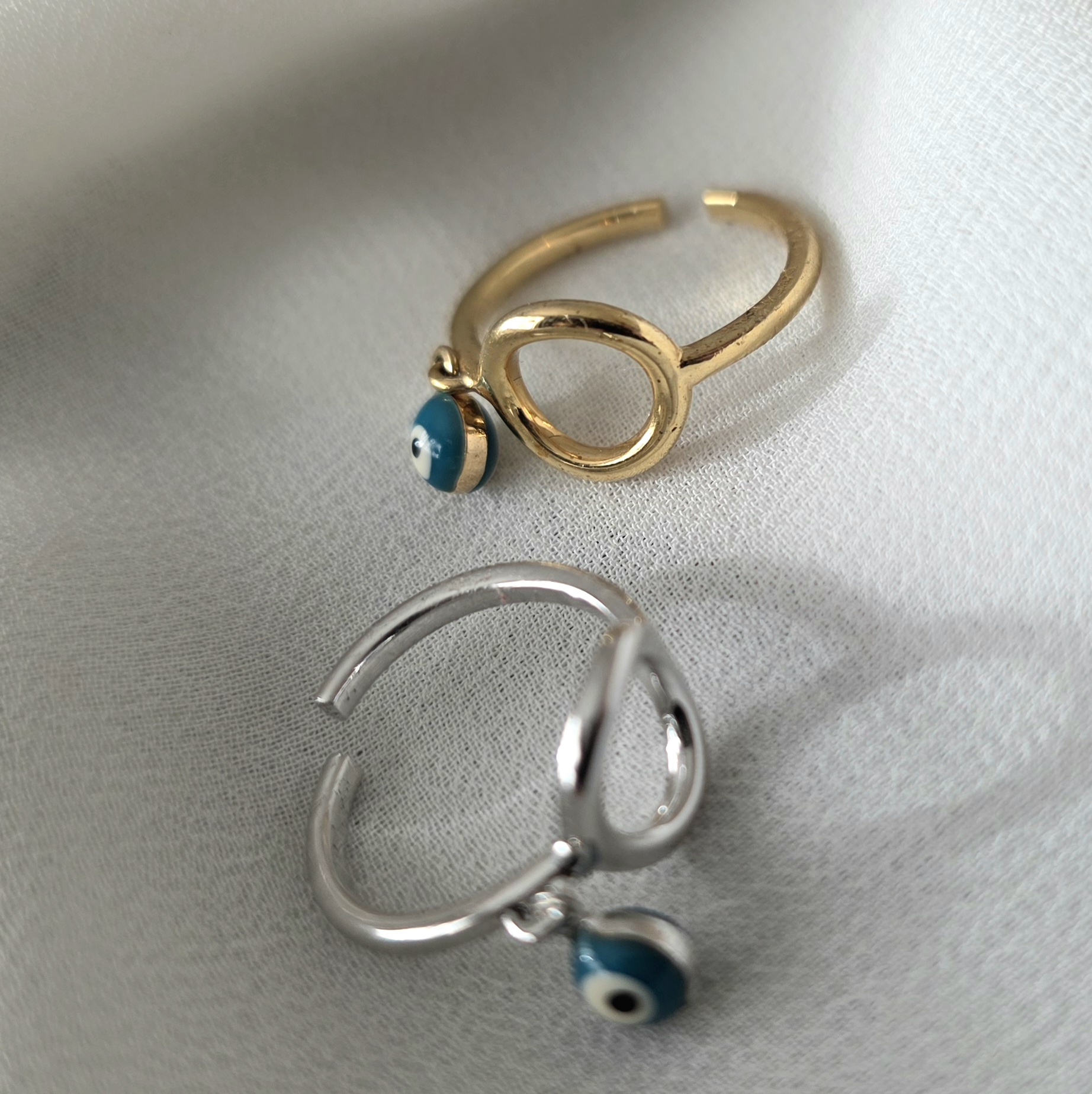 Anel regulavel com pingente de olho grego banhado a ouro 18 K ou rodio.