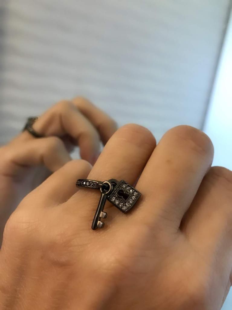 Anel com pingentes de chave e cadeado banhado no rodio negro. Numero 14.