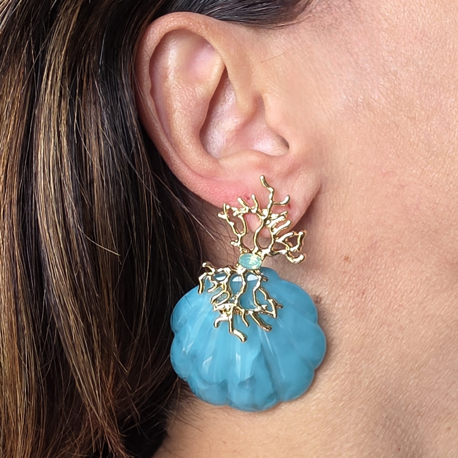 Brinco concha em resina turquesa com banho flash de ouro.