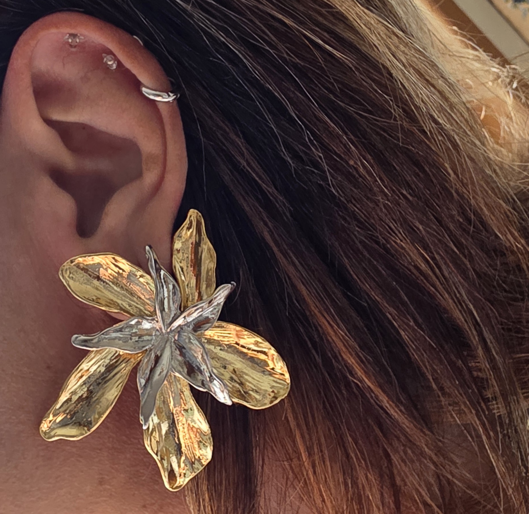 Brinco de flor banhado a ouro, com detalhe no ródio.