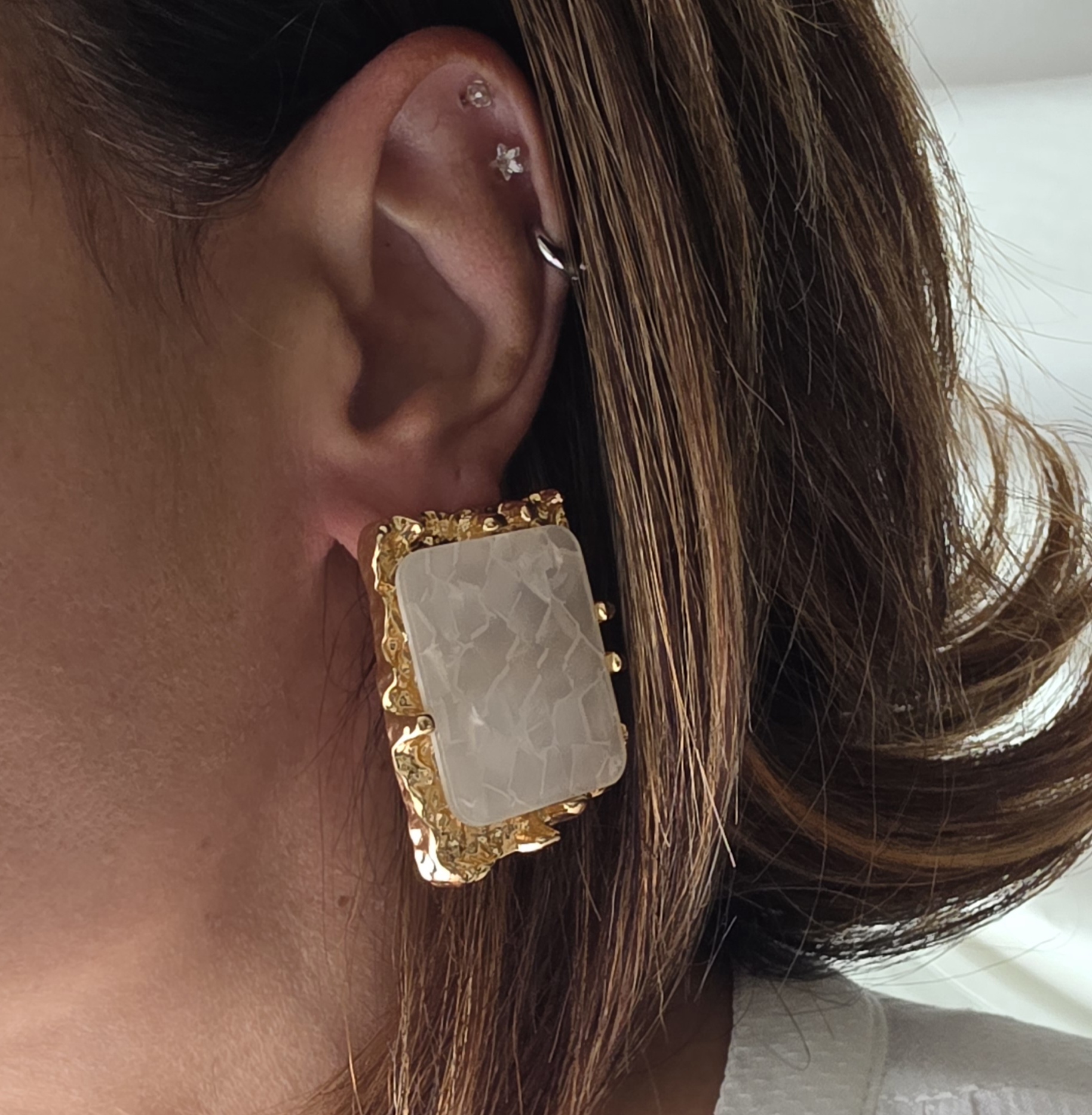 Brinco em resina estilo madrepérola com banho flash de ouro.