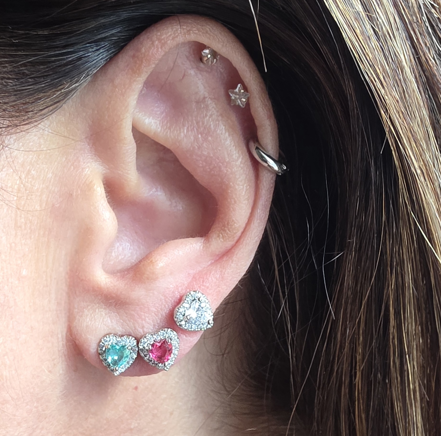 Brinco trio coração colorido banhado a ródio.