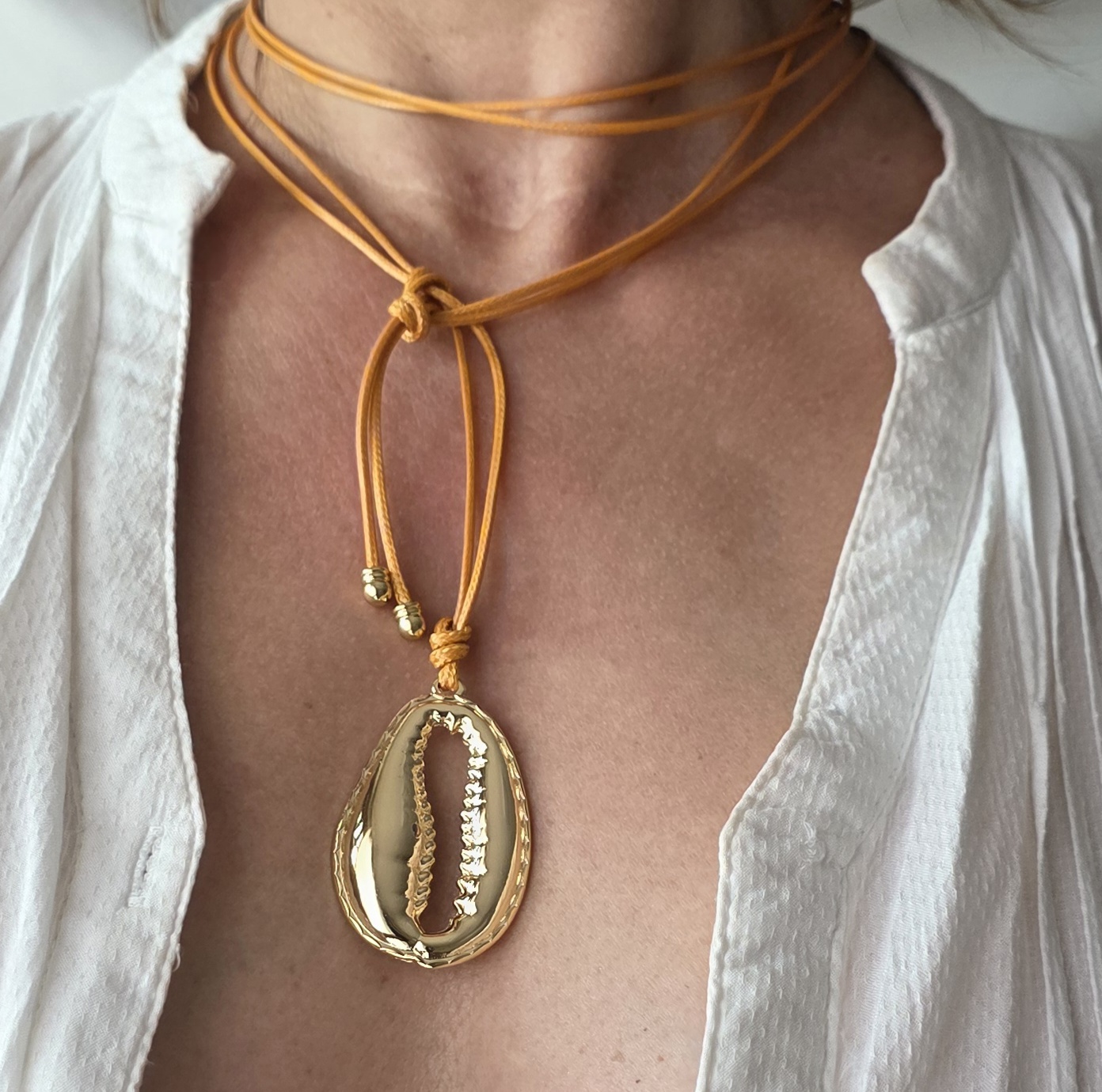 Colar cadarço encerado com buzio e banho flash de ouro.