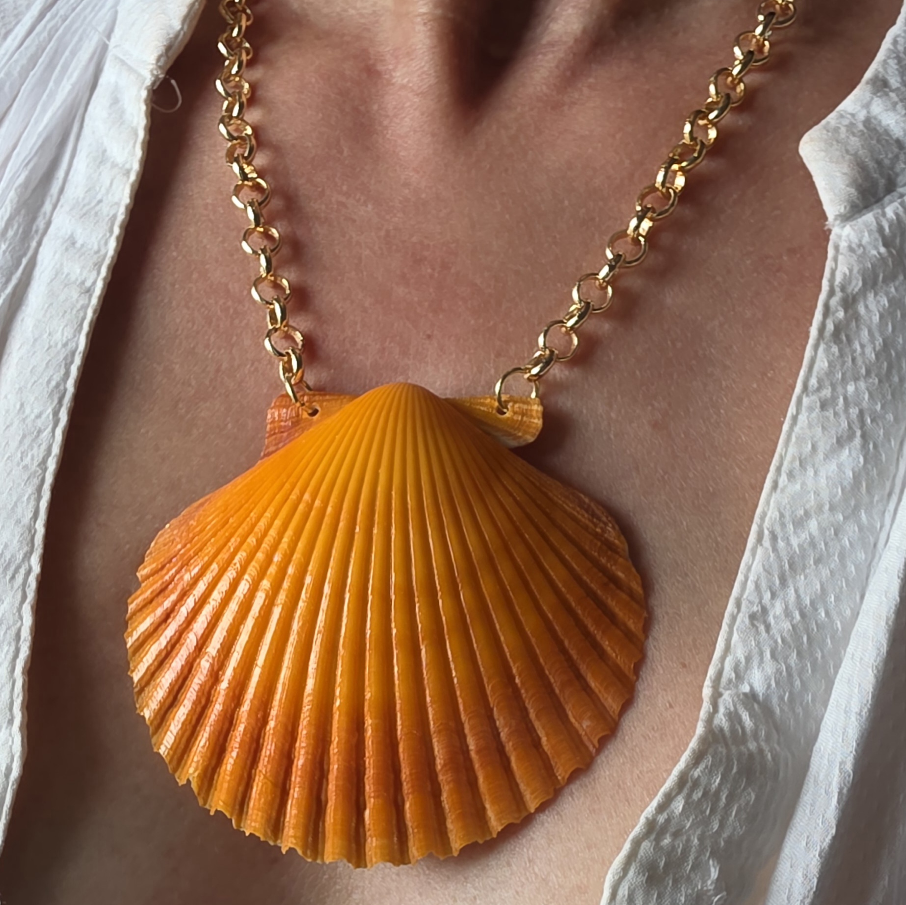 Colar concha laranja com banho flash de ouro.