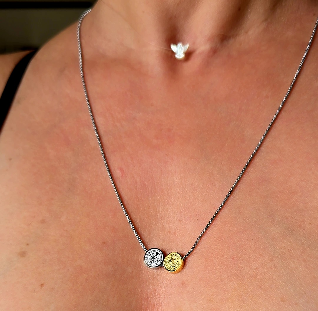 Colar Escapulário com São Bento em Aço Inox com dourado, medindo 65cm.