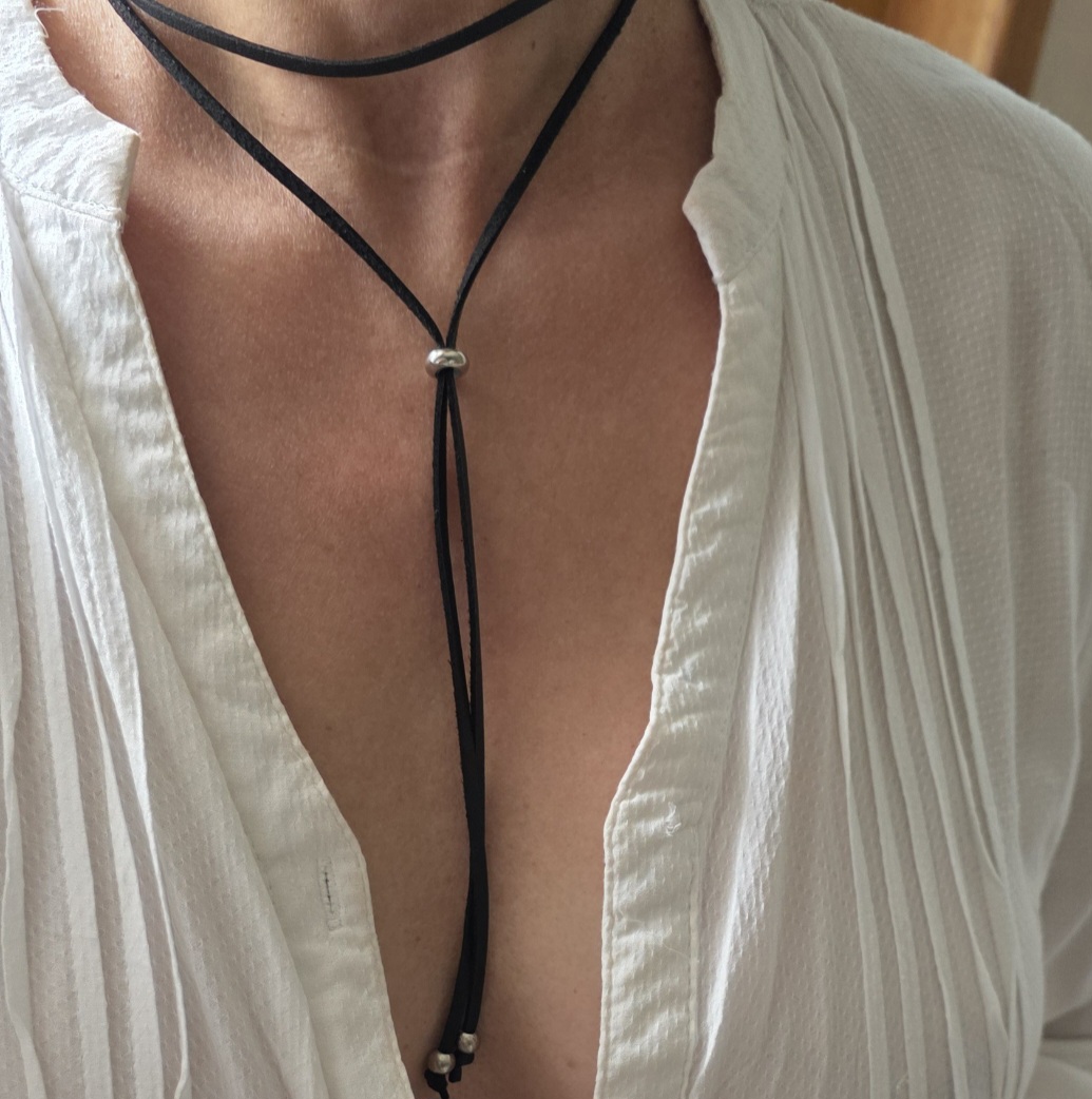 Colar gravatinha courinho prateado.
