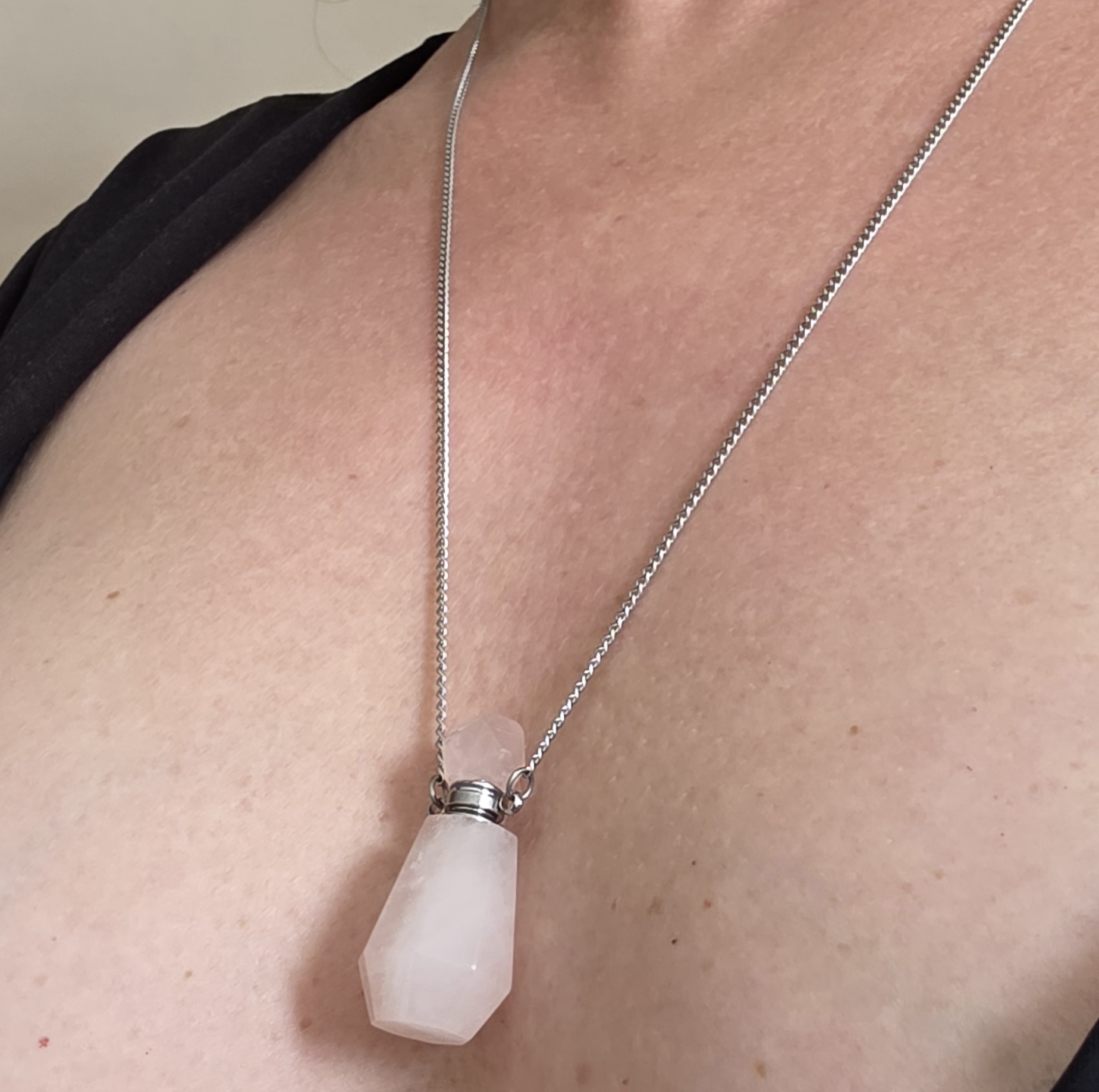 Colar perfumeiro quartzo rosa em aço inox.
